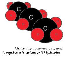 Cette argile organique riche a ensuite été comprimée sous forme de schiste dur sous le poids accumulé d’autres sédiments. Sous le poids de milliers de mètres de sédiments, une hausse de la pression et de la température s’est produite. Quand la température a atteint environ 65 ºC (150 ºF), le carbone et les substances riches en hydrogène se sont regroupés chimiquement pour former des centaines de types différents de molécules d'hydrocarbure, sous forme de chaînes bien structurées d'atomes de carbone avec des atomes d'hydrogène associés. |