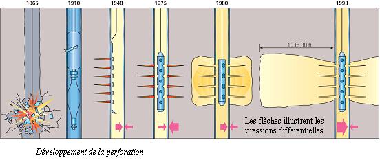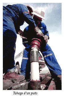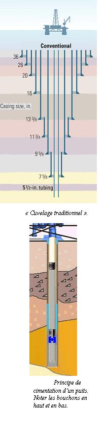 La construction d’un puits se fait en plusieurs étapes. Dans un premier temps, on effectue le forage et la diagraphie du puits. Puis on procède au « cuvelage » et à la cimentation. Chaque étape de forage, « cuvelage » et cimentation s’effectue graduellement, en plusieurs fois. Puis, on met en place le tubage et les packers de production. Enfin, on procède aux perforations dans le « cuvelage » pour permettre la circulation du pétrole dans le tubage. |