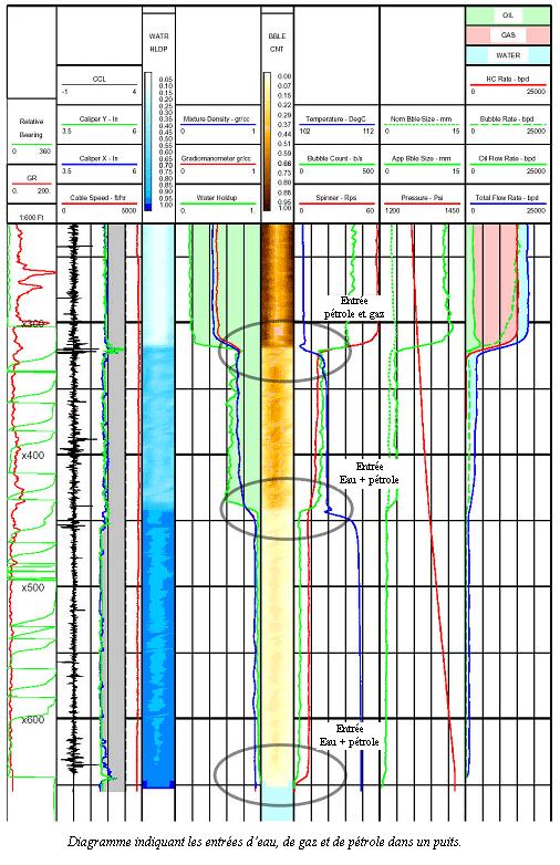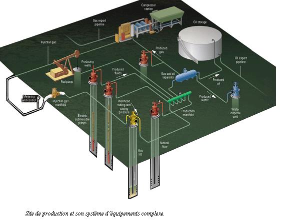 Production La production s'effectue en plusieurs opérations. Dans un premier temps, il est nécessaire d’amener le pétrole à la surface. Ensuite, le puits doit être entretenu et réparé durant son cycle de vie. Enfin, les fluides à l’intérieur du puits étant un mélange de pétrole, de gaz, et d’eau, ils doivent être séparés avant les traitements ultérieurs. L’eau est évacuée, et le pétrole et le gaz sont traités, mesurés et testés avant d’être transportés. Il est très important de surveiller le puits et de connaître l’activité dans le réservoir. L’extraction du pétrole affecte les couches du réservoir et, pour optimiser la production, ces changements doivent être connus. Pour ce faire, une diagraphie des événements à l’intérieur du cuvelage est effectuée régulièrement. Cette diagraphie fournit des informations sur les problèmes et sur les changements qui se produisent