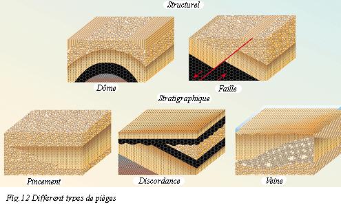Le processus de conversion atteint son maximum dans la plage de 110 ºC (225 ºF) à 180 ºC (350 ºF). Au-dessus de cette température, les molécules lourdes à longue chaîne sont décomposées en molécules plus petites et légères, tel le gaz méthane. Aux températures au-dessus de 260 ºC (500 ºF), le matériau organique est carbonisé et ne peut donner naissance à du pétrole. Ou le trouve t-on ? Depuis le début de l'exploration pétrolière, les géologues constatent qu’un dépôt de pétrole n’est pas dû au hasard. On trouve des dépôts aux endroits où se combinent les éléments géologiques nécessaires à l’apparition d’un gisement de pétrole. |