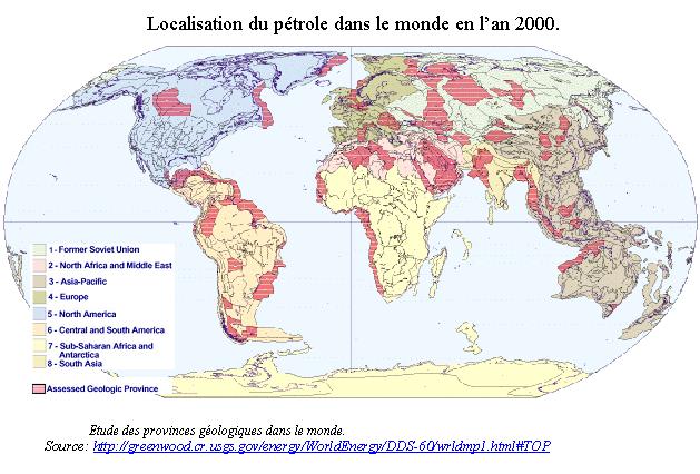 On trouve du pétrole dans d'anciens bassins sédimentaires. Ces régions sont identifiées en rouge sur la carte. Les hydrocarbures ne sont pas distribués uniformément autour du monde. Les onze pays de l'OPEP à eux seuls représentaient 40 % de la production mondiale de pétrole brut en 2000