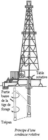Sondeuse rotative La majorité des appareils de forage actuels sont des sondeuses rotatives. Un avantage de la sondeuse rotative est qu’elle opère dans des formations tendres comme l’argile ou les sables meubles. Une sondeuse par battage ne le permet pas. L’argile et le sable retomberaient dans le puits et bloqueraient le trépan. Le trépan et la façon dont il est actionné sont les principales différences entre les deux systèmes. La sondeuse rotative utilise un trépan rotatif avec des rangées de dents qui pénètrent la roche L’appareil de forage racle les morceaux de roche au fur et à mesure de la rotation du trépan. Le trépan est fixé sur une tige de forage formée par plusieurs joints de conduite. On ajoute des joints à la tige de forage à mesure que le trou gagne en profondeur.