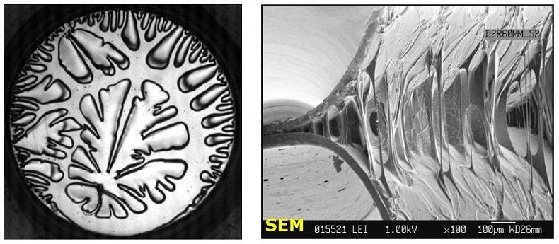 Dans cette conférence nous allons expliquer et illustrer par quelques expériences simples d’adhésion et de déformation, comment les forces de Van der Waals permettent de déformer ces substances collantes. Nous allons partir d’huiles de viscosité importante en allant vers des matériaux plus complexes à base de polymères, qui sont visqueux et élastiques à la fois. Sur la figure 1, la déformation d’une huile visqueuse entre deux plaques est visualisée à travers une plaque transparente. Lorsqu’on augmente la séparation entre les deux plaques, des bulles d’air ou doigts apparaissent et les parois qui les séparent diminuent et forment des filaments liquides qui pontent les deux surfaces. Ces huiles apparaîtront comme modérément collantes au toucher et laisseront un dépôt sur le doigt. A contrario, sur la figure 2, vous pouvez visualiser un cliché de microscopie électronique montrant le décollement d’un ruban adhésif collé sur lui-même. Ce type d’adhésif, bien que fortement collant au toucher, ne laissera aucun résidu sur le doigt. Dans les deux cas, la formation de ces filaments est indissociable d’une impression de collant et nous allons discuter en détails quels sont les principes physiques derrière la formation des ces filaments et donc les critères de conception d’une surface collante. |