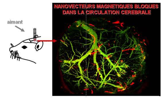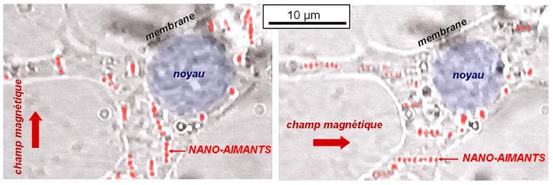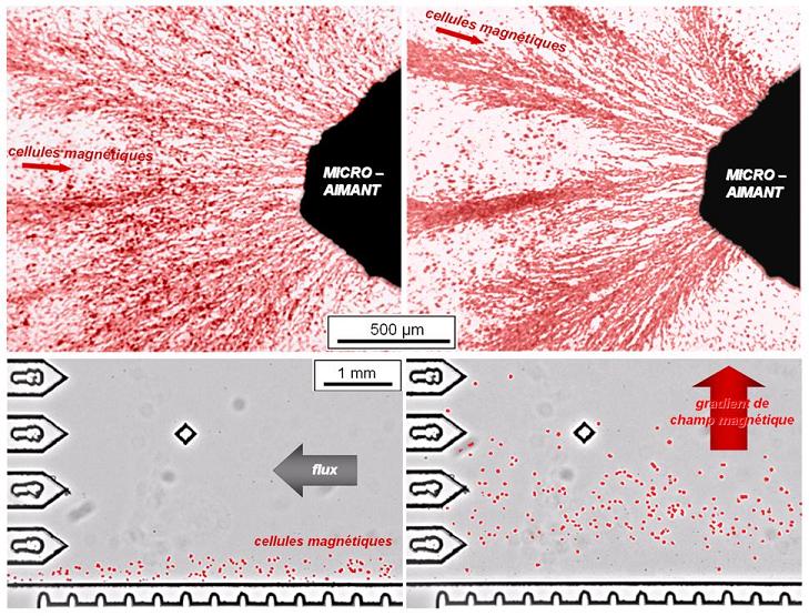ou de la médecine régénérative. Nous avons tous fait l’expérience de l’attraction d’un aimant par un autre. Il est tentant, avec des cellules magnétiques, d’essayer de contrôler leur mouvement et les détourner de leur chemin naturel en les soumettant à une force créée à distance par un aimant. Du point de vue médical, il serait très intéressant de pouvoir forcer des cellules d’intérêt thérapeutique à migrer vers un site cible ou simplement à rester dans l’organe qu’elles doivent régénérer, malgré un flux sanguin par exemple. Ainsi, des cellules magnétiques, en migration sur une surface, sont massivement détournées vers une pointe magnétique, tandis que d’autres, en circulation dans un micro-canal sont déviées de la direction du flux lorsqu’un gradient de champ magnétique est appliqué. Un enjeu majeur des nanotechnologies est d’élaborer des vecteurs à l’échelle nanométrique capables de protéger, transporter et délivrer un médicament au plus près de sa cible. L’objectif est de limiter les effets secondaires, tout en améliorant l’efficacité du médicament en le concentrant sur sa cible. De nombreux systèmes transporteurs sont actuellement testés, mais leur association à des nanoparticules magnétiques apporte des fonctionnalités supplémentaires : ces vecteurs magnétiques, à l’instar de cellules, sont sensibles à une force magnétique et peuvent être attirés par des aimants externes ou internes vers un site cible, comme par exemple une tumeur ou être bloqués dans la circulation cérébrale. De plus, leur localisation peut être contrôlée par IRM. Enfin, ils peuvent également être chauffés via les nano-aimants qu’ils contiennent, ce qui permet de contrôler l’ouverture du vecteur et le relargage du médicament.