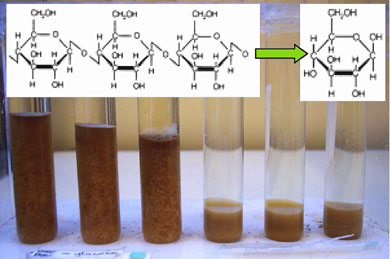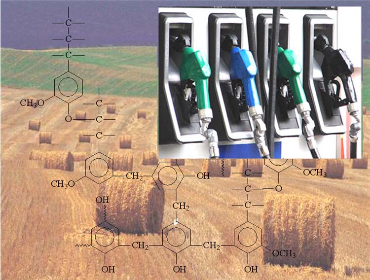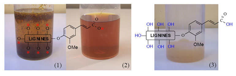 Ainsi, en traitant les parois lignifiées en milieu alcalin (en condition de sévérité variable selon la matière première), on élimine une partie des lignines, véritable ciment enrobant les chaînes de cellulose et les hémicelluloses, pour libérer des fibres enrichies en cellulose (Figure 2). Ces fibres de cellulose constituent la matrice de la pâte à papier et peuvent être utilisées comme renfort dans des agro-matériaux. Elles représentent en outre une importante source de glucose qui, libéré par hydrolyse enzymatique ou acide (Figure 3), peut être fermenté en bio-éthanol et autres molécules « synthons » pour la chimie. Les lignines, solubilisées en milieu alcalin grâce à l’ionisation de leurs groupes phénoliques, peuvent être récupérées par acidification, ce qui provoque leur précipitation. Une fois purifiées, ces lignines peuvent être utilisées dans des applications diversifiées allant des matières plastiques biodégradables aux boues de forage en passant par l’utilisation comme liant dans des produits formulés destinés à l’alimentation animale (Figure 4).