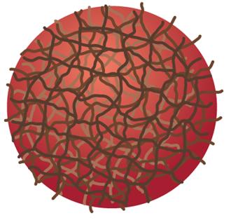Figure 3 : représentation schématique 3D d’un microgel. Le filet de polymère réticulé est gonflé par le solvant qui est ainsi retenu par effet osmotique. (Dessin : Erik Zumalt (Université du Texas à Austin). La compréhension