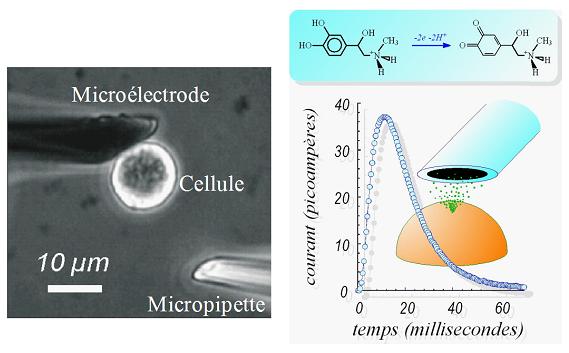 Représentation d’une expérience de détection de libération de neurotransmetteurs. A gauche : une ultramicroélectrode est positionnée au voisinage de la cellule étudiée. Une micropipette sert par ailleurs à stimuler la cellule. A droite : réponse typique (courant en fonction du temps) obtenue et due à l’oxydation des neurotransmetteurs libérés à la surface de l’électrode. Nous mentionnerons enfin quelques évolutions récentes au laboratoire visant à « voir » les événements de libération dans leur globalité. Ceci nécessite alors l’utilisation d’électrodes encore plus sophistiquées dont nous présenterons la fabrication et les applications à notre problématique.